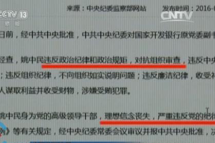 2016年9月13日,国家开发银行原党委副书记、监事长姚中民严重违纪被开除党籍和公职,在中央纪委的通报中,我们可以看到这样的字眼:理想信念丧失、严重违反党的纪律,违反政治纪律和政治规矩、对抗组织审查、违反组织纪律,违反廉洁纪律。一条条的违纪事实具体又清晰。这和十八大之初,一两句话简单说明违纪情况形成了鲜明的对比。