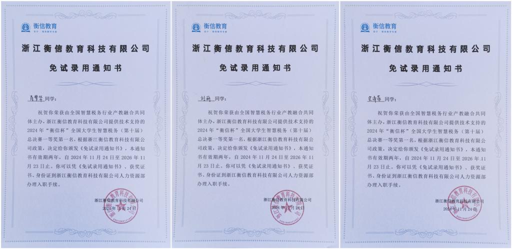 3位同学获浙江衡信教育科技有限公司的免试入职通知书