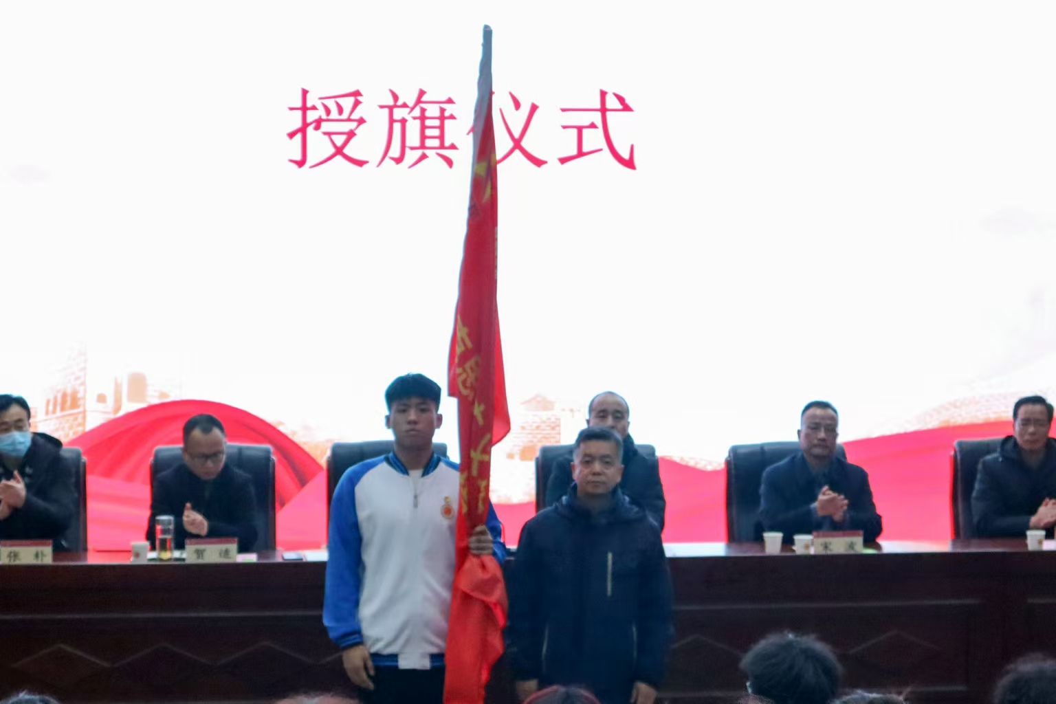 朱华斌为第十六期“青马工程”培训班(团校)授旗,学员代表李杰豪同学上台接旗,“筑梦青马,不负韶华”的口号响彻会场。