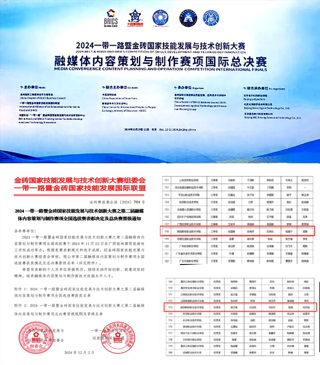 2024一带一路暨金砖国家技能发展与技术创新大赛之第二届“融媒体内容策划与制作”赛项不仅考察了参赛者的融媒体专业知识与职业素养,还重点检验了他们的项目分析与策划能力、融媒体作品制作及协同合作能力。自赛项启动以来,学校高度重视,选派优秀师生组建团队参赛。备赛过程中,团队成员认真研究竞赛规则,查阅相关资料,反复剖析样题,最终在263支参赛队伍的竞争中,由梁灏、刘丹柏、钱涌宁老师指导的两支队伍获得全国选拔赛三等奖1项,优秀奖1项。
