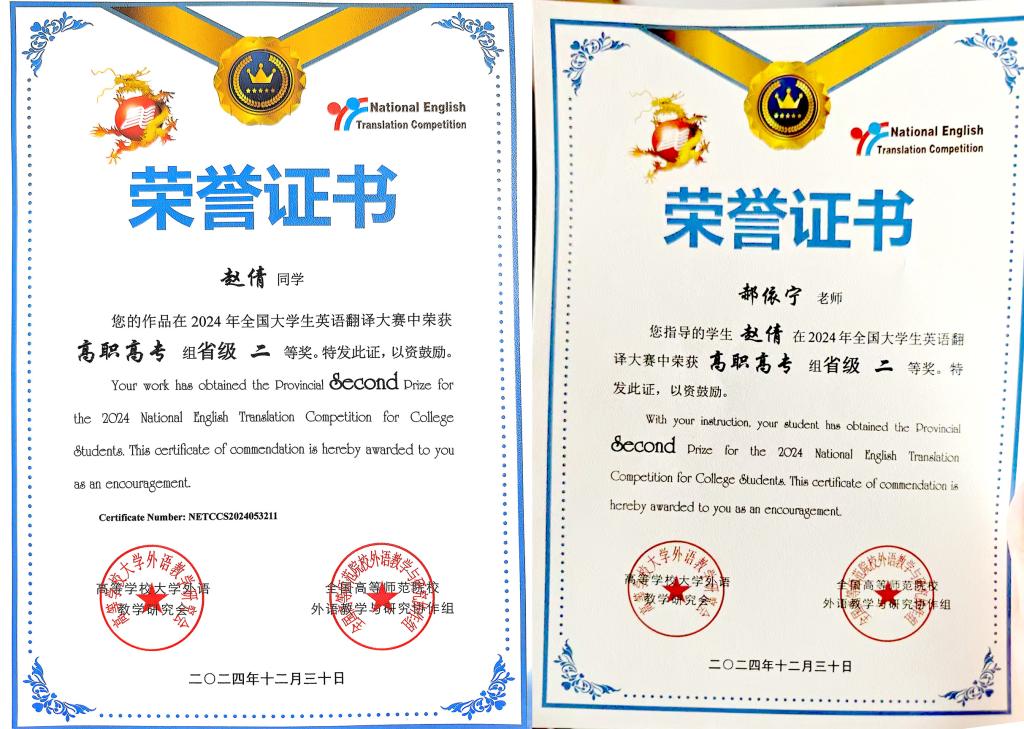 近日,我校人文艺术学院教师郝依宁指导的2024级学生赵倩在全国大学生英语翻译大赛中喜获高职高专组省级二等奖的好成绩。全国大学生英语翻译大赛(简称NETCCS),由高等学校大学外语教学研究会和全国高等师范院校外语教学与研究协作组联合举办,旨在培养大学生的跨文化交流意识,该赛事举办至今已累计吸引3000所高校近30万名学生参赛,覆盖所有985、211高校,在全国范围内具有较高的影响力。
