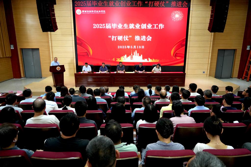为全面落实党中央、国务院和省委、省政府关于高校毕业生就业工作的决策部署,认真贯彻全国、全省高校毕业生等青年群体就业创业工作视频会议精神,聚力打好2025届毕业生稳就业促增收硬仗,5月19日,我校在学术报告厅召开2025届毕业生就业创业工作“打硬仗”推进会。党委书记高玉峰、校长程书强出席会议,全体处科级干部、全体辅导员及大学生就业指导中心人员参加会议,党委副书记朱华斌主持会议。